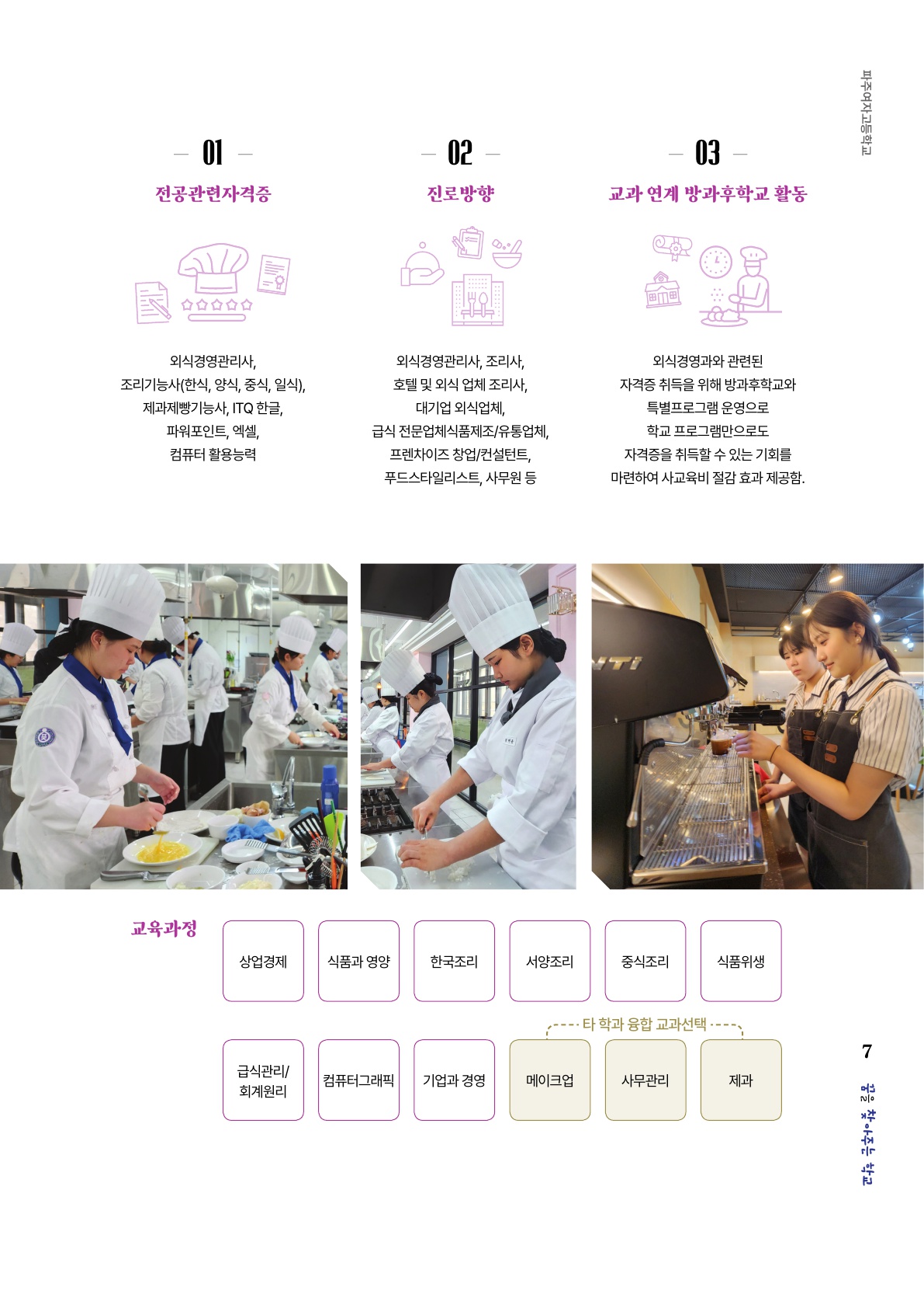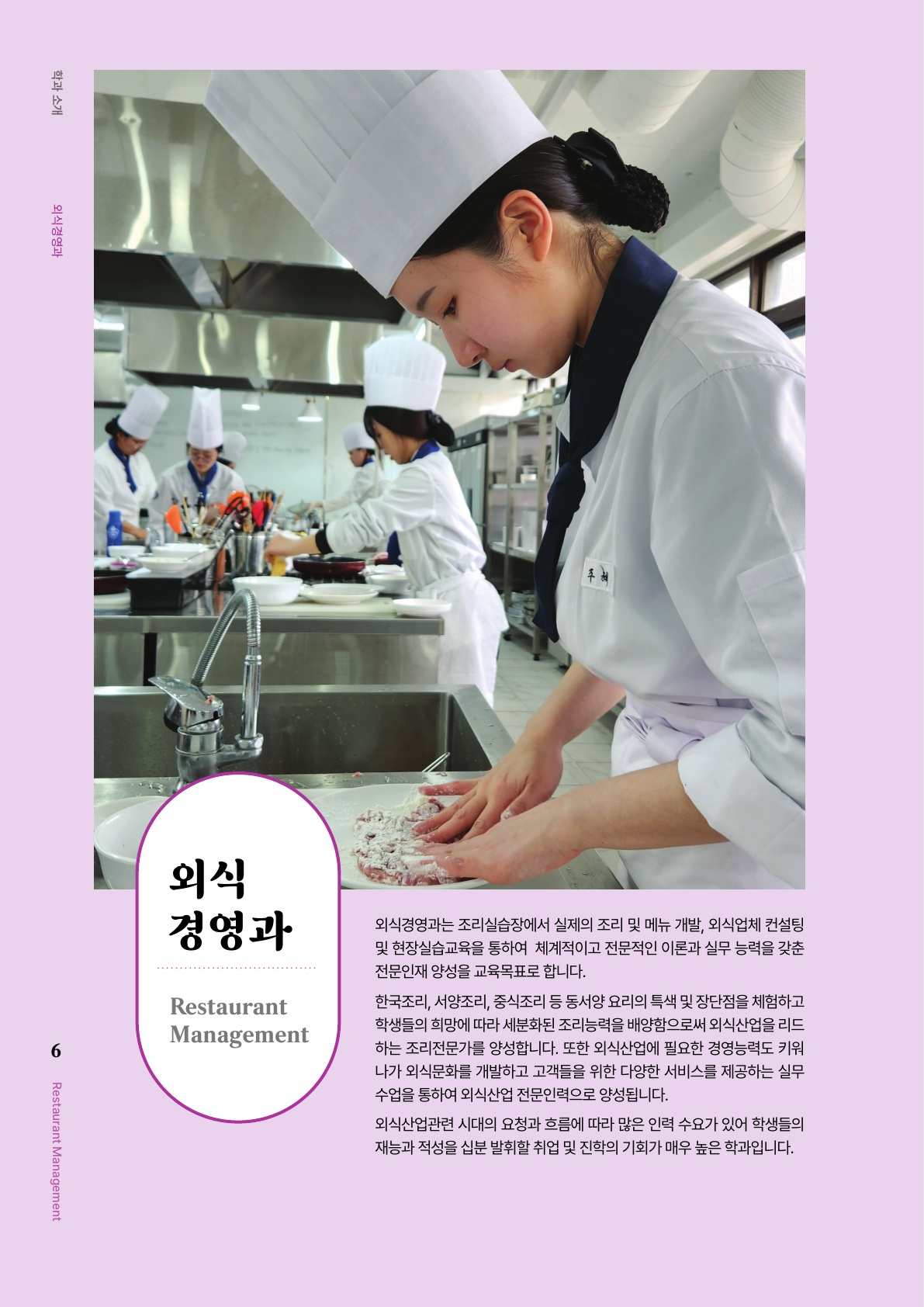 외식경영과는 조리실습장에서 실제의 조리 및 메뉴 개발, 외식업체 컨설팅 및 현장실습교육을 통하여 체계적이고 전문적인 이론과 실무 능력을 갖춘 전문인재 양성을 교육목표로 합니다. 한국조리, 서양조리, 중식조리 등 동서양 요리의 특색 및 장단점을 체험하고 학생들의 희망에 따라 세분화된 조리능력을 배양함으로써 외식산업을 리드하는 조리전문가를 양성합니다. 또한 외식산업에 필요한 경영능력도 키워나가 외식문화를 개발하고 고객들을 위한 다양한 서비스를 제공하는 실무수업을 통하여 외식산업 전문인력으로 양성됩니다. 외식산업관련 시대의 요청과 흐름에 따라 많은 인력 수요가 있어 학생들의 재능과 적성을 십분 발휘할 취업 및 진학의 기회가 매우 높은 학과입니다.