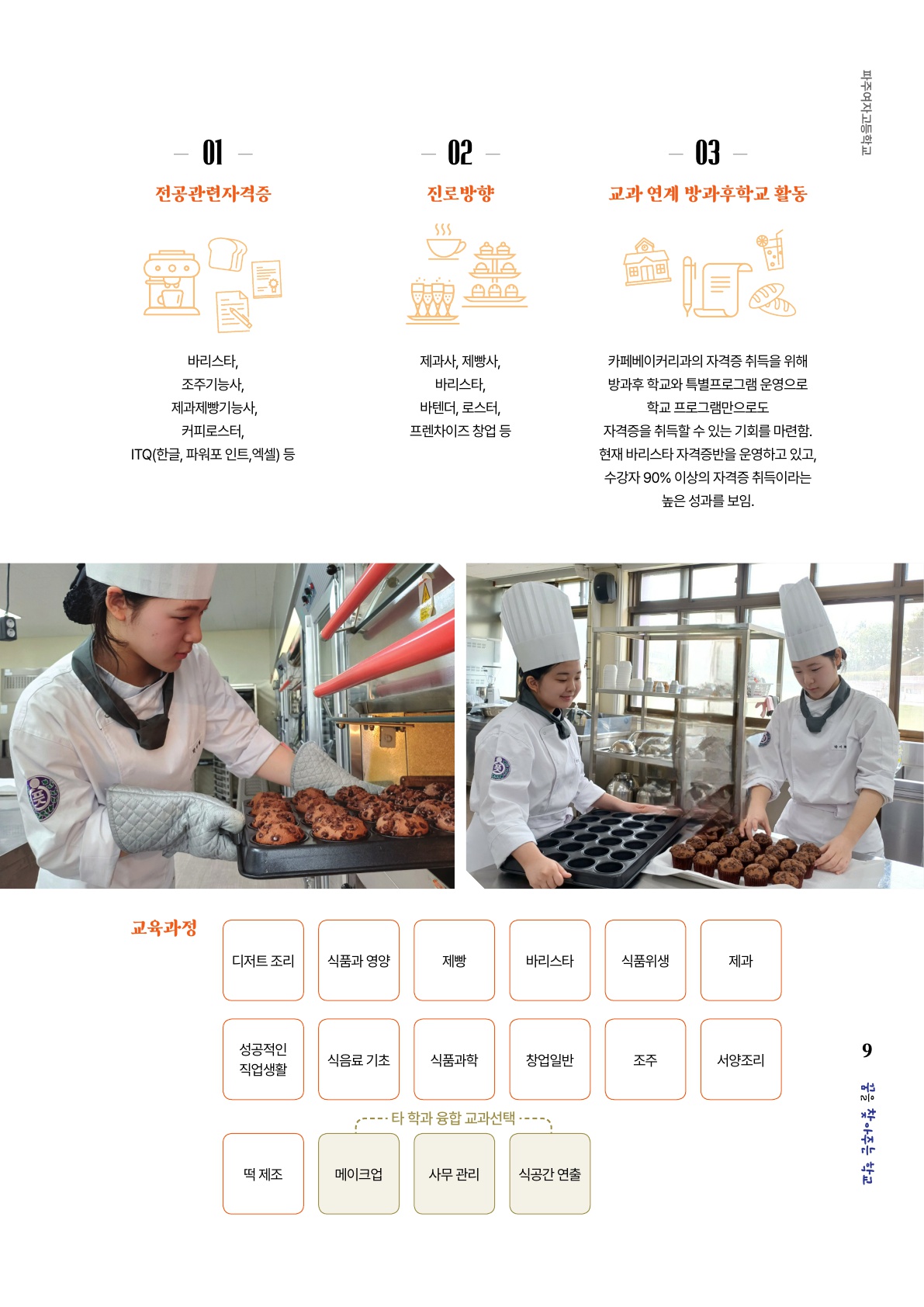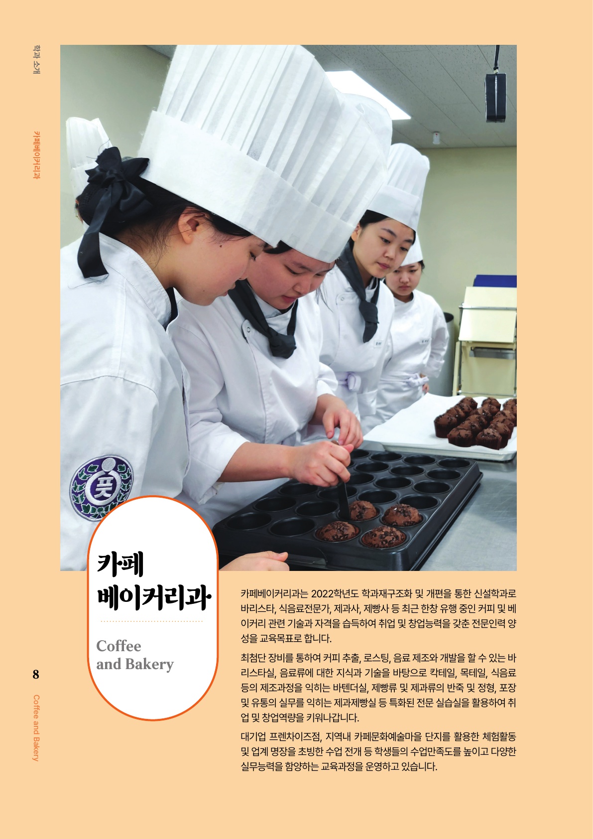 카페베이커리과는 2022학년도 학과재구조화 및 개편을 통한 신설학과로 바리스타, 식음료전문가, 제과사, 제빵사 등 최근 한창 유행 중인 커피 및 베이커리 관련 기술과 자격을 습득하여 취업 및 창업능력을 갖춘 전문인력 양성을 교육목표로 합니다. 최첨단 장비를 통하여 커피 추출, 로스팅, 음료 제조와 개발을 할 수 있는 바리스타실, 음료류에 대한 지식과 기술을 바탕으로 칵테일, 목테일, 식음료 등의 제조과정을 익히는 바텐더실, 제빵류 및 제과류의 반죽 및 정형, 포장 및 유통의 실무를 익하는 제과제빵실 등 특화된 전문 실습실을 활용하여 취업 및 창업역량을 키워나갑니다. 대기업 프렌차이즈점, 지역내 카페문화예술마을 단지를 활용한 체험활동 및 업계 명장을 초빙한 수업 전개 등 학생들의 수업만족도를 높이고 다양한 실무능력을 함양하는 교육과정을 운영하고 있습니다.
